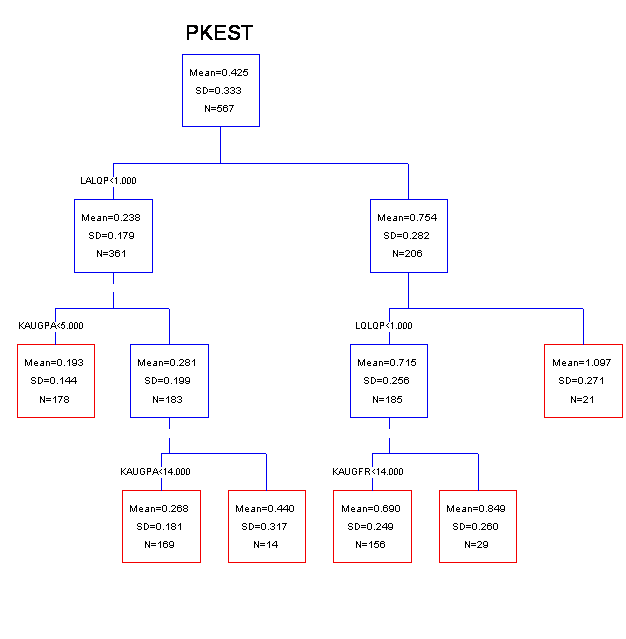 Joonis 2. Regressioonipuu pauside kestuste modelleerimiseks tekstis. Muutujad: LQLQP – lõigulõpu tunnus, LALQP – lauselõpu tunnus, KAUGPA – kaugus eelmisest pausist, KAUGFR – kaugus fraasi algusest.