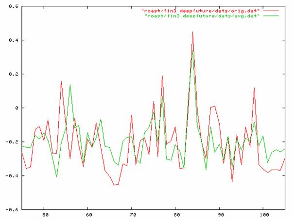 Joonis 3. Häälikukestuste (logaritmitud) prognoosiväärtuste (heledam, roheline joon) võrdlus originaaliga (tumedam, punane joon).