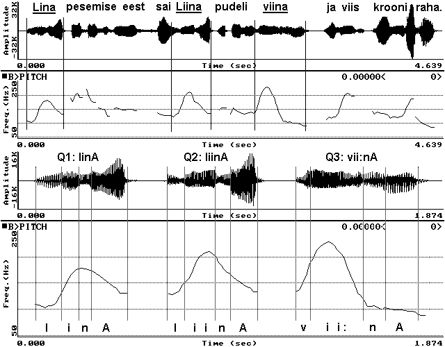 Joonis 1. Väldete realiseerumine lauses Lina pesemise eest sai Liina pudeli viina ja viis krooni raha.Sõna põhitoonikontuur on realiseeritud prosoodiamudelis just eeltoodud kirjeldustest lähtudes.